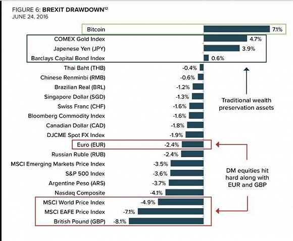 灰度公司在2019年的一份研究中发现,当主流金融业面临经济危机时,比特币市场受益最大。例如,在2016年6月至2016年12月的英国脱欧担忧期间,比特币价格上涨了7.1%。同期欧元和英镑分别下跌2.4%和8.1%。与此同时,摩根士丹利资本国际全球价格指数下跌4.9%。