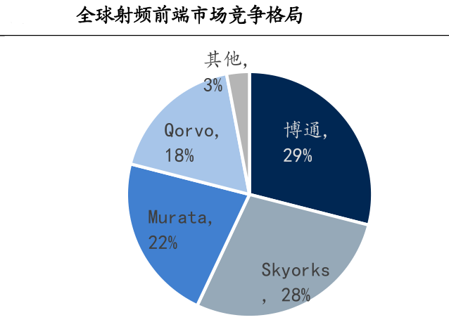 目前射频前端的产品几乎被几家国外公司垄断,根据Yole的统计,市场份额最大的为博通(AVGO.O),其次是Skyworks(SWKS.O)、Murata(6981.T)、Qorvo(QRVO.O)。