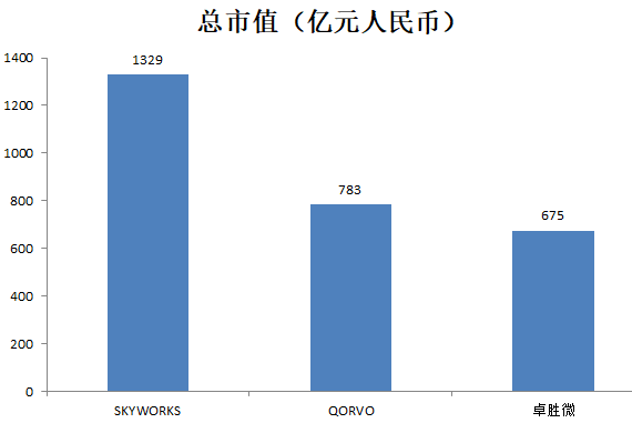 行业同类公司的市值是一个很好的参考指标,目前业务和卓胜微比较相像的上市公司有Skyworks和Qorvo两家公司,都在美股上市。可以看到,卓胜微的总市值已经和Qorvo十分接近了,大约是Skyworks的一半。