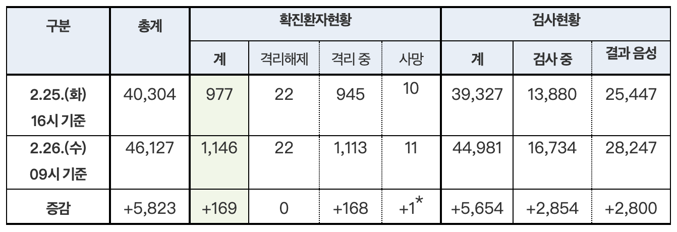 韩国中央防疫对策本部26日通报说,截至当天上午9时,韩国较昨日新增169例新冠病毒感染病例,累计确诊1146例,死亡增至11例,治愈22例。在新增的169例病例中,分别有134例和19例来自疫情集中爆发的大邱和庆北地区。