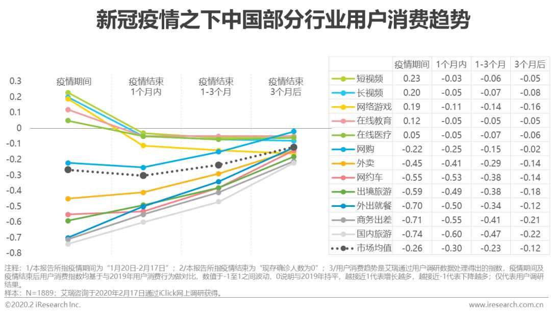 在疫情的影响下,线下消费场景,尤其是聚集性消费场景为主的行业遭重创,家庭消费及线上消费成为主要消费场景——其中国内旅游消费指数-0.74,商务出差消费指数-0.71,外出就餐消费指数-0.70,是艾瑞用户调研结果中消费下滑最明显的三个行业;短视频、长视频、网络游戏、在线教育和在线医疗是用户消费相较2019年有所增长的行业。