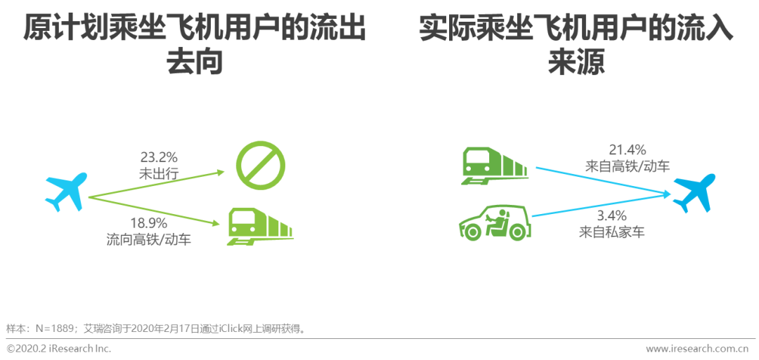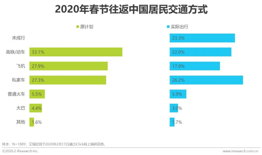 2020年春节,受疫情影响,出于安全考虑,23.3%用户取消了原有出行返乡计划。各类主要交通工具中,高铁/动车和飞机受影响最严重,用户比例大幅下降;其中,高铁/动车下降11.1%,飞机下降10.0%。居民异地出行需求在未来一段时间将持续处于低谷,远途交通行业不仅面临着各交通工具之间的替代性竞争,更面临着严峻的用户留存考验,航空业众多公司或面临新一轮洗牌。