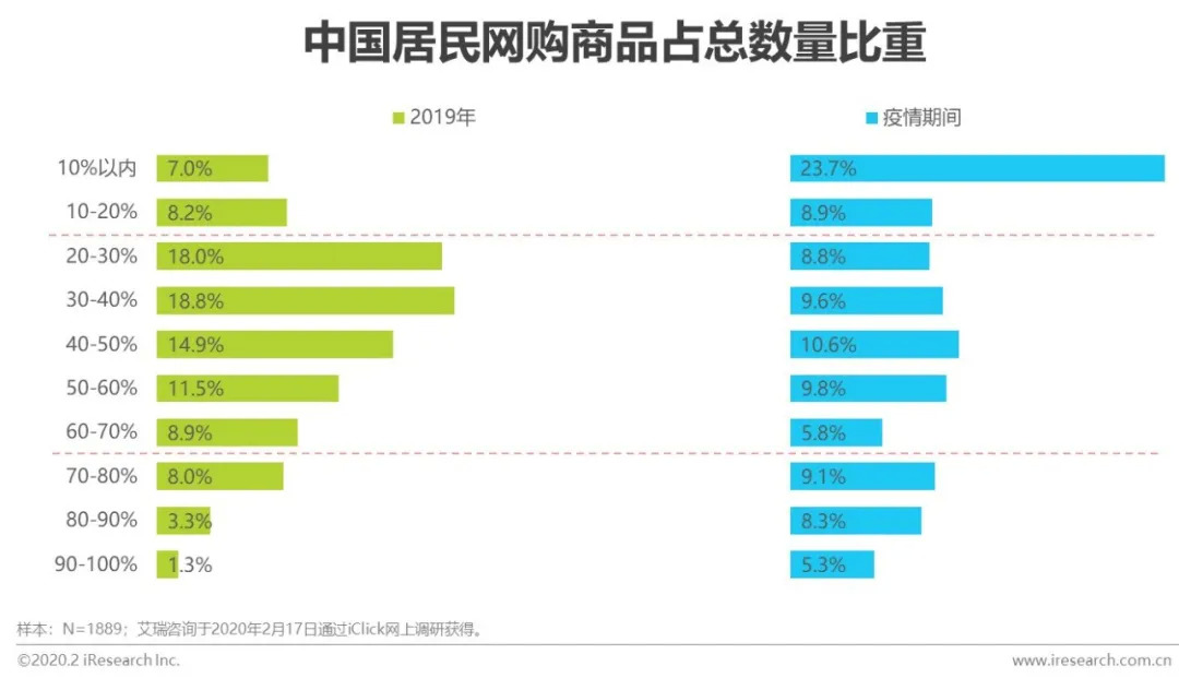 疫情期间,用户线上线下购物双双下滑,对比2019年,网购消费指数为-0.22,线下购物消费指数为-0.40。从网购商品数量占比来看,一部分用户选择尽量不网购,占比20%以下的用户比例上升,尤其占比10%以内的用户比例大幅上涨;另一部分用户选择将线下购物需求转移到线上,占比70%以上的用户比例上升。未来一段时间网购的消费趋势将持续高于市场整体,对于轻度用户的唤醒和重度用户的维系和重新争夺是未来一段时间网购行业的关注重点。