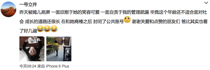 “昨天被嫣儿刷屏 一面欣慰于她的笑容可爱 一面自责于我的管理疏漏 毕竟这个年龄还不适合面对社会 成长的道路还很长 在和她商榷之后 封闭了公共账号[悲伤] 谢谢关爱和点赞的朋友们 爸比其实也看了好几遍”。