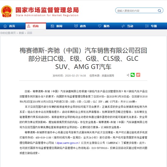 近日,梅赛德斯-奔驰(中国)汽车销售有限公司根据《缺陷汽车产品召回管理条例》和《缺陷汽车产品召回管理条例实施办法》的要求,向国家市场监督管理总局备案了召回计划,涉及车辆共为11166辆。