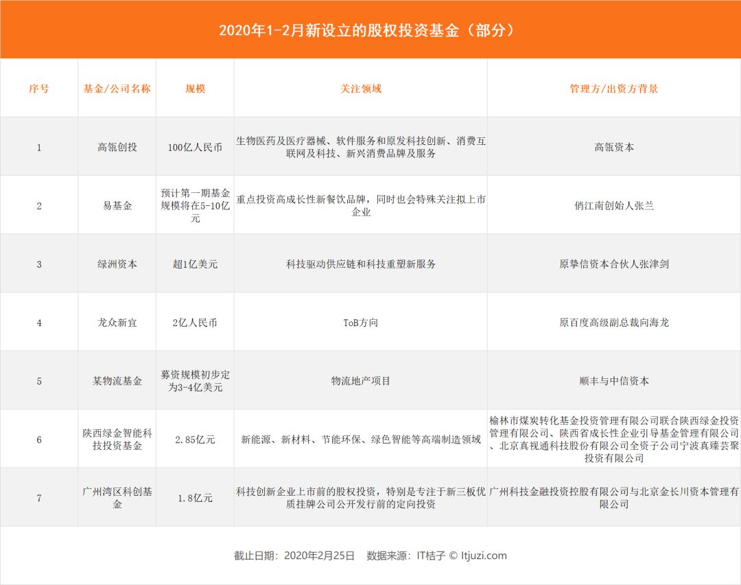 IT 桔子统计观察显示,截止到 2 月 25 日,在 2020 年中共计有超过 7 只新的股权基金成立,包括老牌 PE 高瓴资本新设立高瓴创投、原挚信资本合伙人张津剑成立绿洲资本、原百度高级副总裁向海龙成立龙众新宜、原俏江南创始人张兰设立的易基金等等。