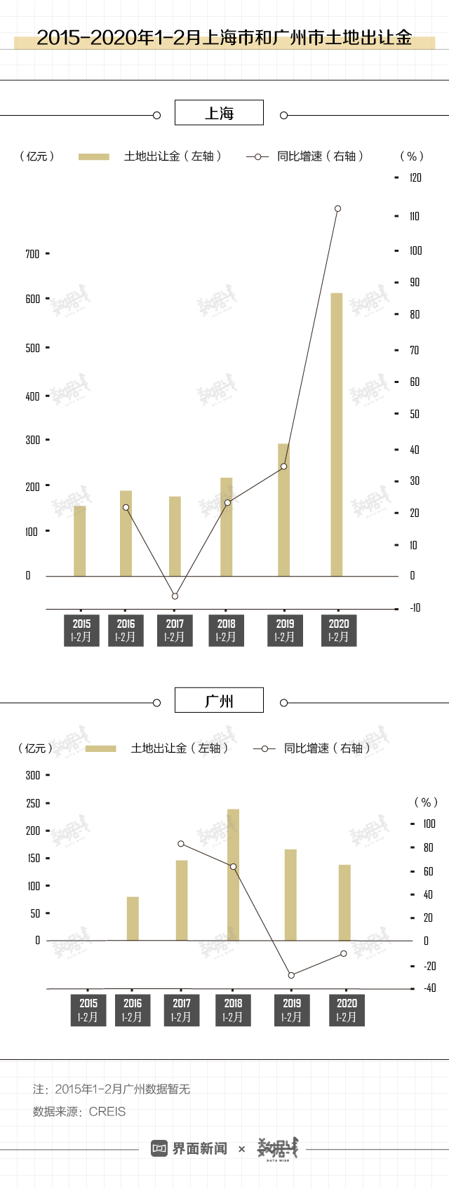 不止北京。CREIS数据显示,2020年1月-2月,上海市土地出让金总额达到619亿元,比去年同期高出1倍多,创下自2015年以来新高。