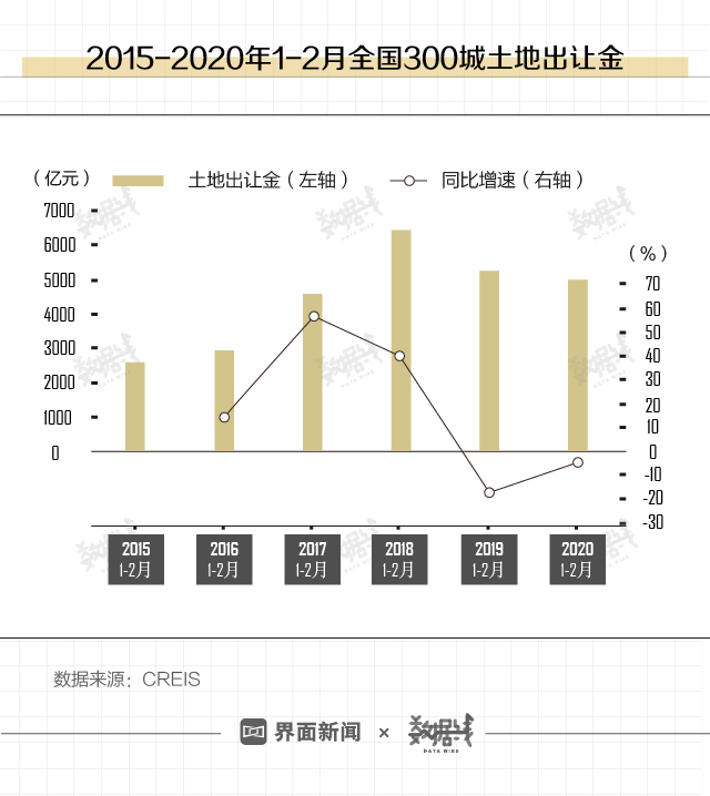 全国情况如何?据CREIS数据,2020年1-2月,全国300城土地出让金合计5030亿元,比去年减少252亿元,同比下降4.77%。