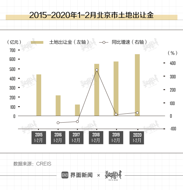 据CREIS数据,2020年1-2月,北京市土地出让金总额达到672.7亿元,比去年同期高出83.3亿元,为近6年来新高。