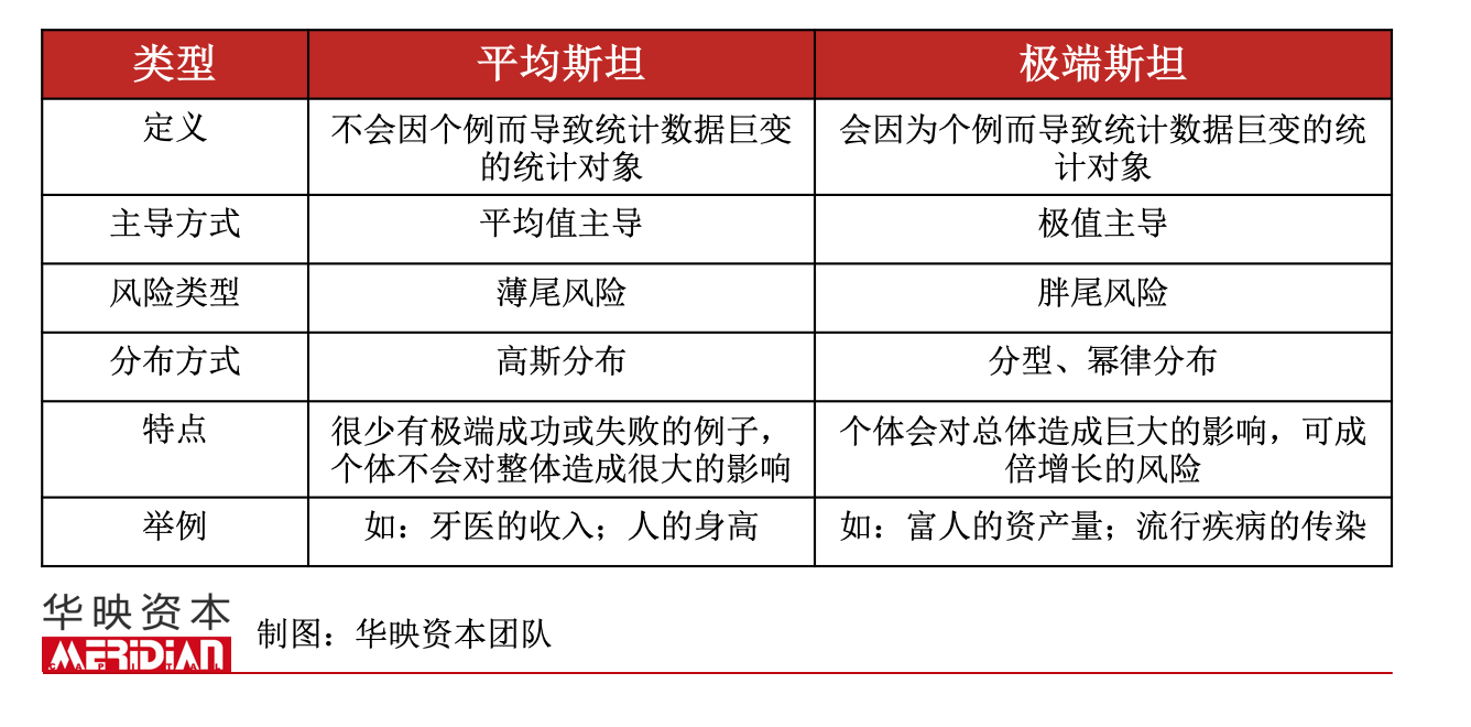 随机事件可以被归为两种统计学属性:平均斯坦(Mediocristan)和极端斯坦(Extremistan)。平均斯坦是薄尾的,并且受影响的个体不会再波及他人,而极端斯坦从定义上看,会对较大范围的人群造成影响,有平均斯坦所不具备的系统性影响和可倍增的风险,比如流行病。