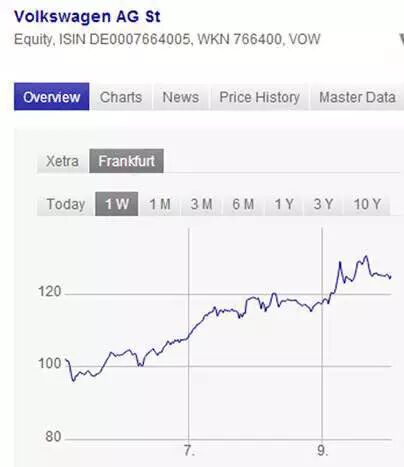 1100万辆柴油车的排放作弊丑闻让大众汽车股票在过去两周几乎腰斩,投资人损失惨重。但是近2天来,大众汽车的股票却开始强势反弹,截止周五(德国时间10月9日)收盘,大众股价增长8.35%,达到125.9欧元。