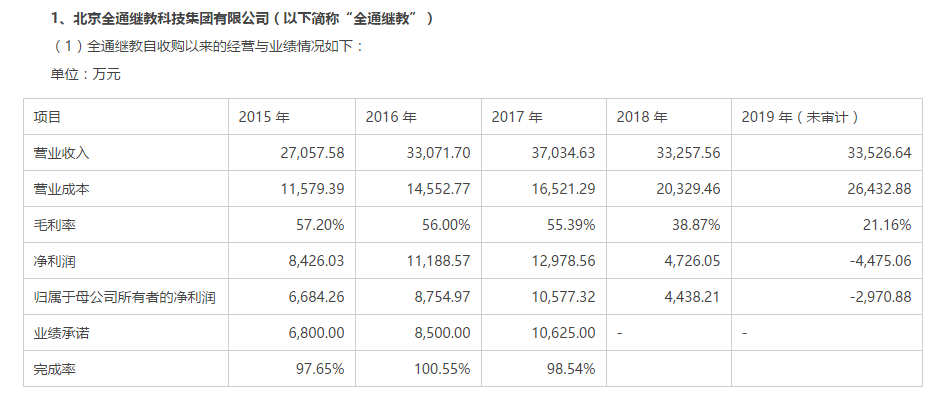 其中最大、也最失败的并购案是全通教育在2015年以10.50亿元收购继教网(后更名“全通继教”),增值率达到938.46%形成商誉10.78亿元。在三年业绩承诺期中,继教网两度未完成业绩目标,2019年甚至出现了亏损,导致全通教育被迫将商誉几乎悉数计提。