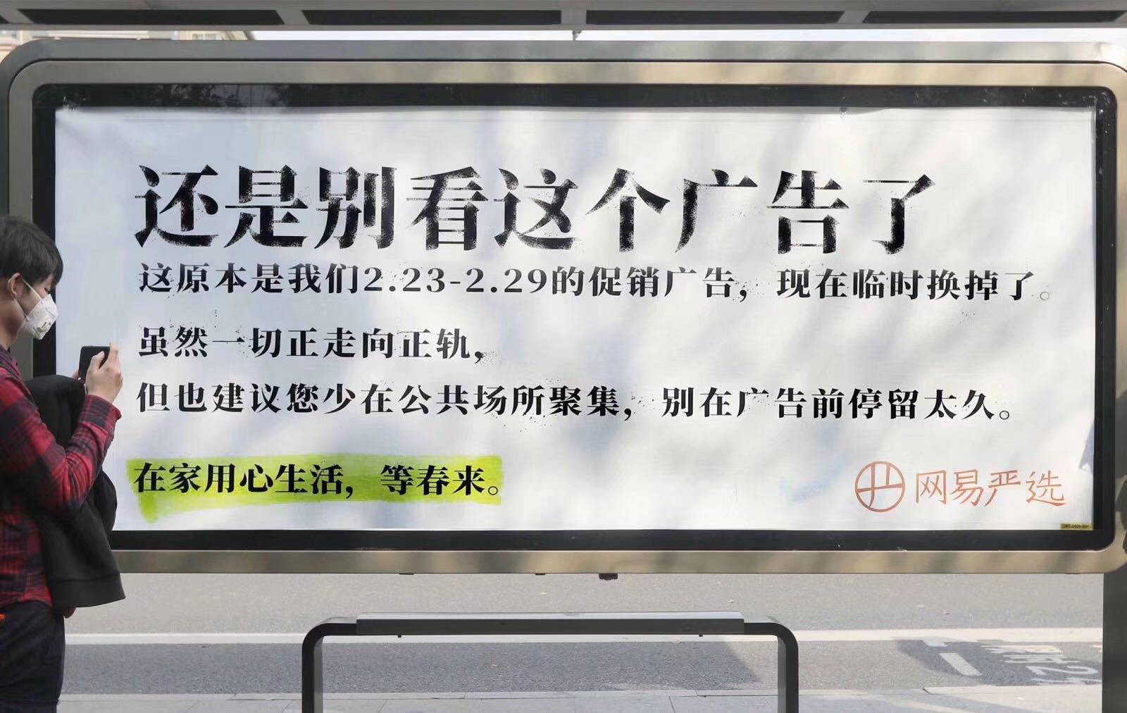 假如你最近碰巧路过杭州的湖滨商圈,大概会被延安路这里一个巨幅的广告牌所吸引,大字写着“还是别看这个广告了”,小字解释称“这原本是我们2.23-2.29的促销广告,现在临时换掉了。虽然一切走向正轨,但也建议您少在公共场所聚集,别在广告前停留太久。在家用心生活,等春来。”——这是网易严选的广告。