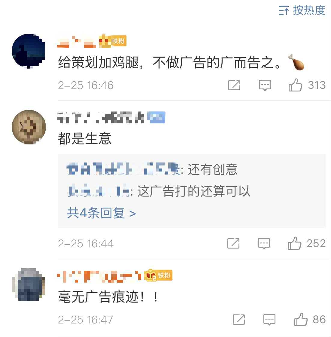 “给创意加鸡腿”“毫无广告痕迹”“本来没人会停下来看广告的,现在有了”网友纷纷评论道。