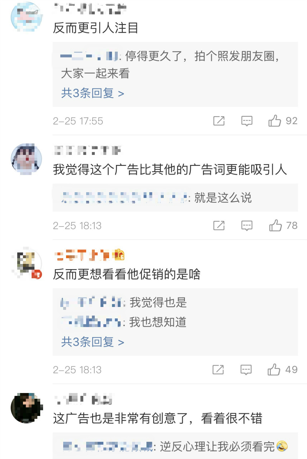 它的逻辑在于,是用一种逆向思维的方式来吸引注意力——让你别看,但还是传递出了促销的信息点(2.23-2.29号促销),又体现了品牌的公益关怀,还支持了政府工作。