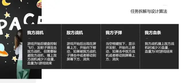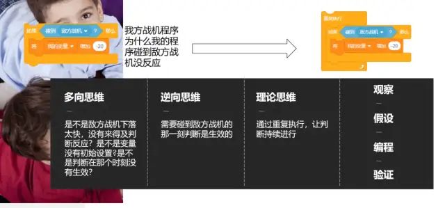 举一个例子:同样是编写一个飞机大战游戏,不具备编程思维的孩子是不知道如何完成这个任务的,最多只会去查资料找答案;但是具备编程思维的孩子首先会进行角色与任务分解,然后为每一个任务设计算法,然后写出每一个基础程序,再不断通过“观察——假设——编程——验证”四步编程法进行迭代,最终完成一个属于自己的飞机大战游戏。