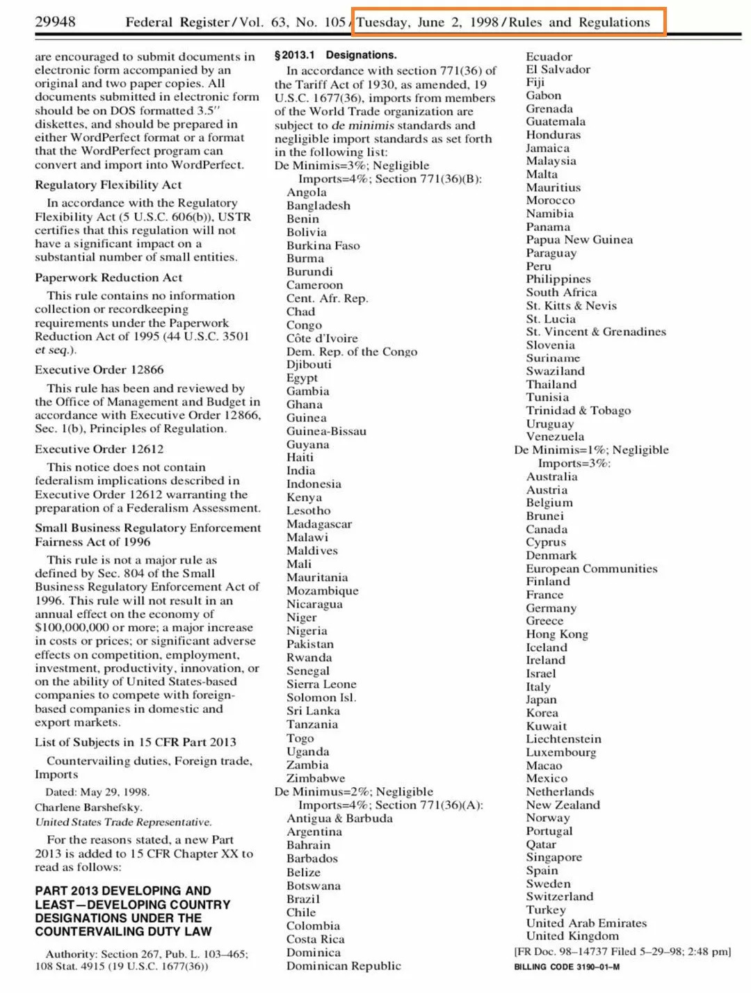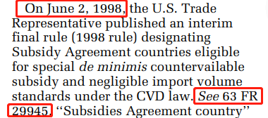 中国2001年加入WTO后,美国并未修订过1998年的这份清单。虽然中国并不在美国1998年清单中,但是2006年以来,美国对中国产品开始发起反补贴调查。值得注意的是,美国对中国适用的一直是与发达国家相同的1%的微量补贴标准,而不是与发展中国家相同的2%。