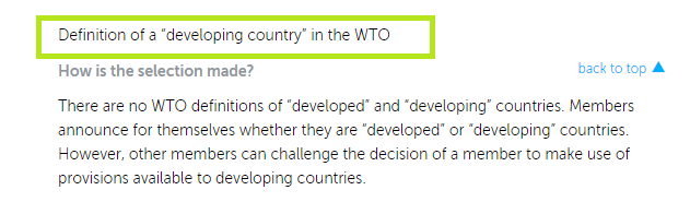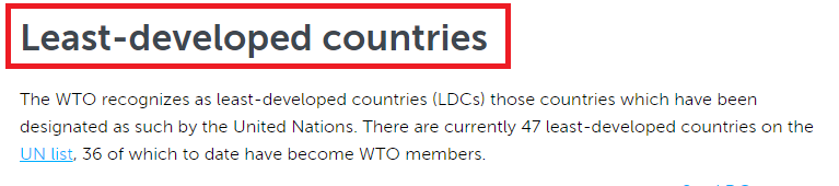 但是,除了最不发达国家(Least-developed countries)被联合国官方盖了戳(上图),在WTO官网上,对于怎么划分发展中国家(Developing country)并无定义(下图),成员们都是自行认定的。