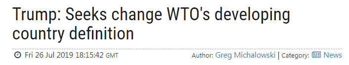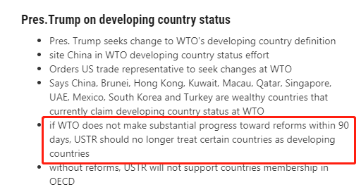 2019年7月26日,白宫还发布了《改革世界贸易组织发展中国家地位备忘录》,提出要阻止那些“自我认定”为发展中国家但“不具备合适经济指标支持”的成员国在世贸组织享受特殊和差别待遇的灵活性,并表示如果WTO不能在90天内朝改革方向取得实质性进展,美国将单方面取消部分发展中成员相关待遇。