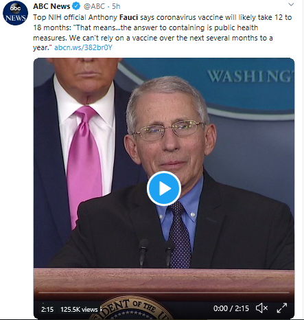 对此,NIH的下属的国家过敏症与传染病研究所(NIAID)主任福西在新闻发布会上做了进一步介绍。他强调,从得到病毒基因序列到最后疫苗的问世最少需要12个月的时间,以确定其安全性和有效性。