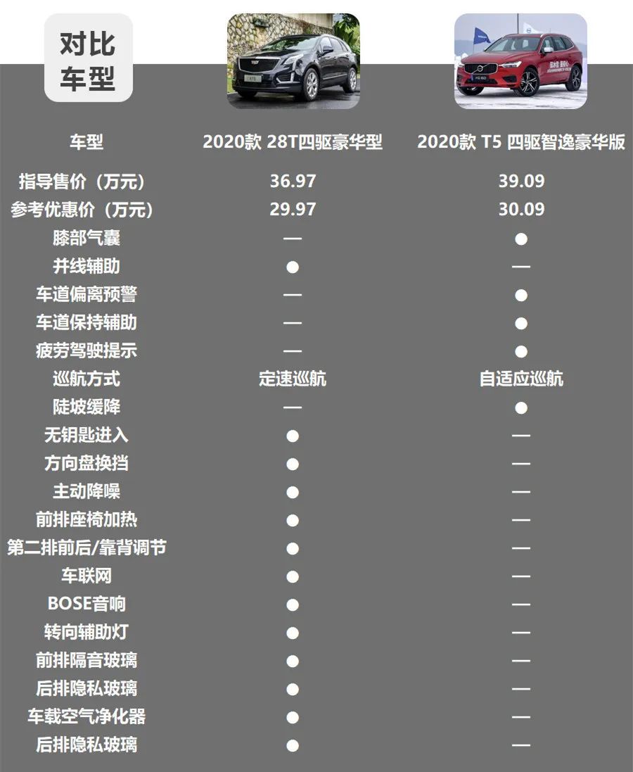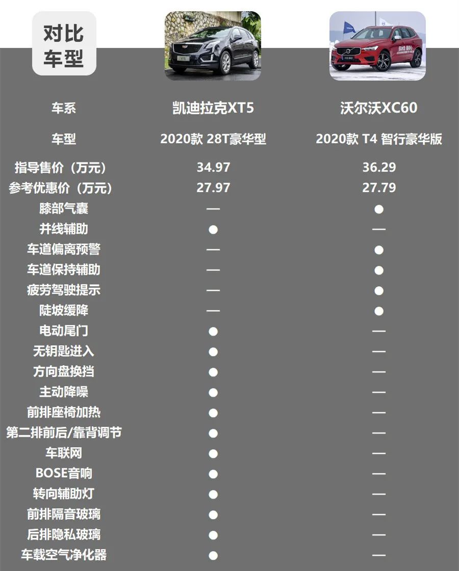 在终端裸车28万元的价位段,沃尔沃XC60只能买到T4版车型,而凯迪拉克XT5已经可以买到28T豪华型。从配置对比我们可以看出,沃尔沃XC60除了在主被动安全配置方面更加完善之外,舒适性配置完全不如凯迪拉克XT5。所以在28万元价位段,小智更推荐大家选择凯迪拉克XT5的2020款28T豪华型,当然对于预算更低的朋友,28T技术型的性价比也不错。