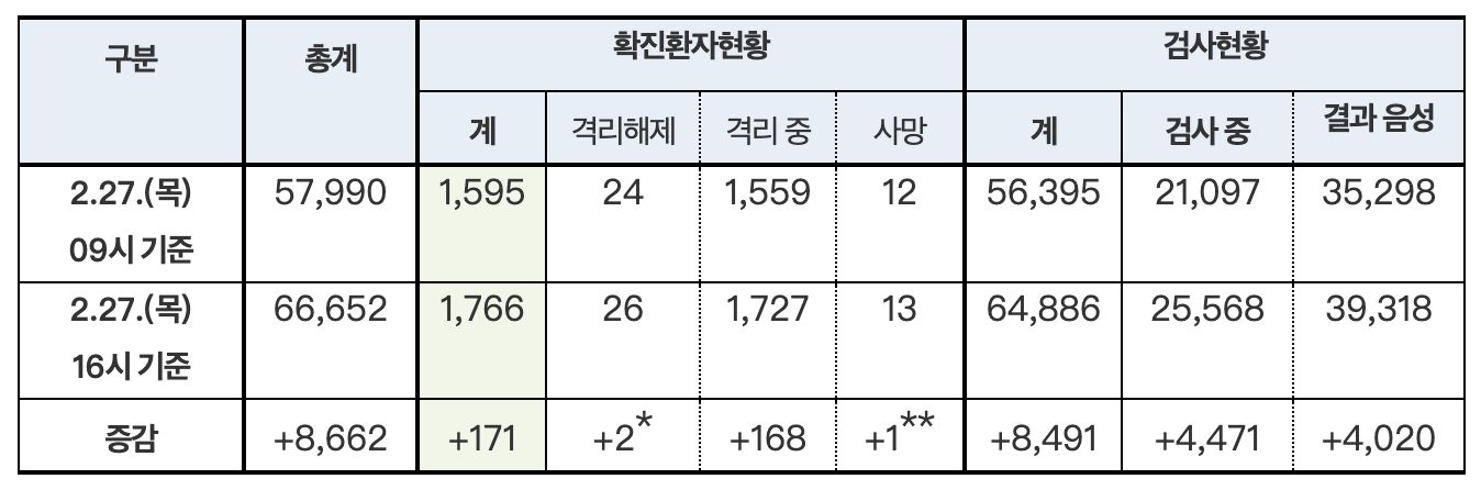 韩国中央防疫对策本部2月27日通报说,截至当天下午4时,韩国较当天上午9时新增171例新冠病毒感染病例,累计确诊1766例,死亡增至13例,治愈增至26例。