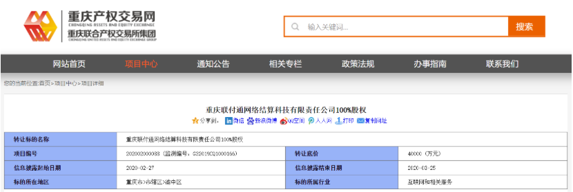 2月27日,重庆产权交易网挂出公告,重庆联付通网络结算科技有限责任公司(以下称“联付通”)挂牌转让其100%股权,转让底价4亿元。