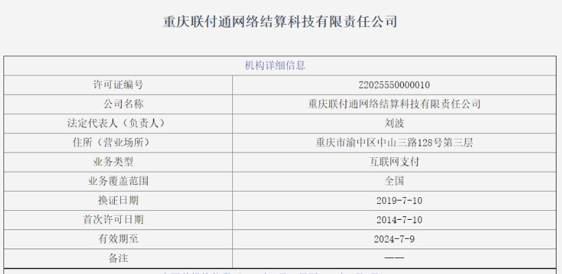 央行信息显示,联付通2014年7月10日首次获得支付牌照,2019年10月换证,有效期至2024年7月9日。目前其业务类型为互联网支付,业务覆盖范围为全国。