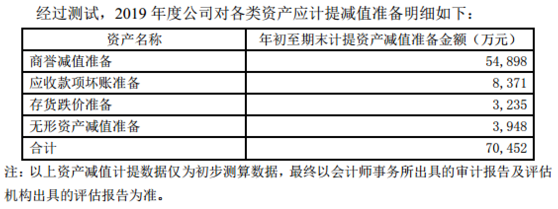 对此,北斗星通称,业绩的下降,主要原因为公司结合实际经营情况及宏观环境、行业政策的变化,根据《企业会计准则第8号-资产减值》及相关会计政策规定,对商誉及资产进行了减值测试,经初步测算计提资产减值金额7.05亿元。