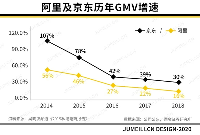 根据吴晓波频道发布的《2019私域电商报告》,从2014年开始,电商市场增速下滑,互联网流量红利消退,以阿里京东为代表的传统电商巨头流量饱和,出现获客难、获客成本居高不下的情况。