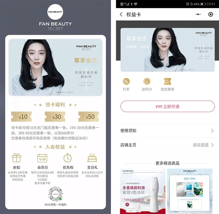 △左图为FanBeauty微信社群内推送的卡片,引导客户在小程序上注册为尊享会员,有意识培养客户的小程序购买习惯;右图为小程序链接打开后,开通会员权益的界面
