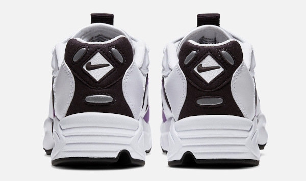 细节方面,鞋带孔、鞋舌、鞋身侧面和后跟都带有较为小型的Swoosh标识,统一使用更深邃的紫罗兰配色。