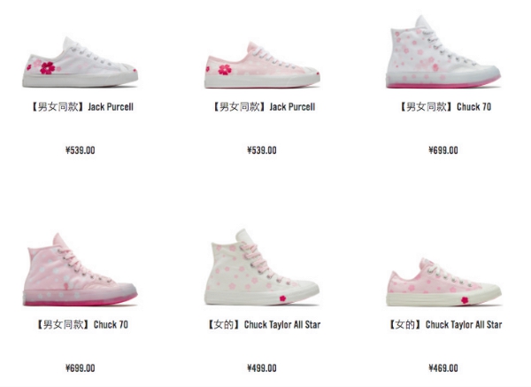 这一系列包括Chuck Taylor All Star、Chuck 70和Jack Purcell等经典鞋款,鞋子以粉色或白色为主色调,搭配樱花图案。