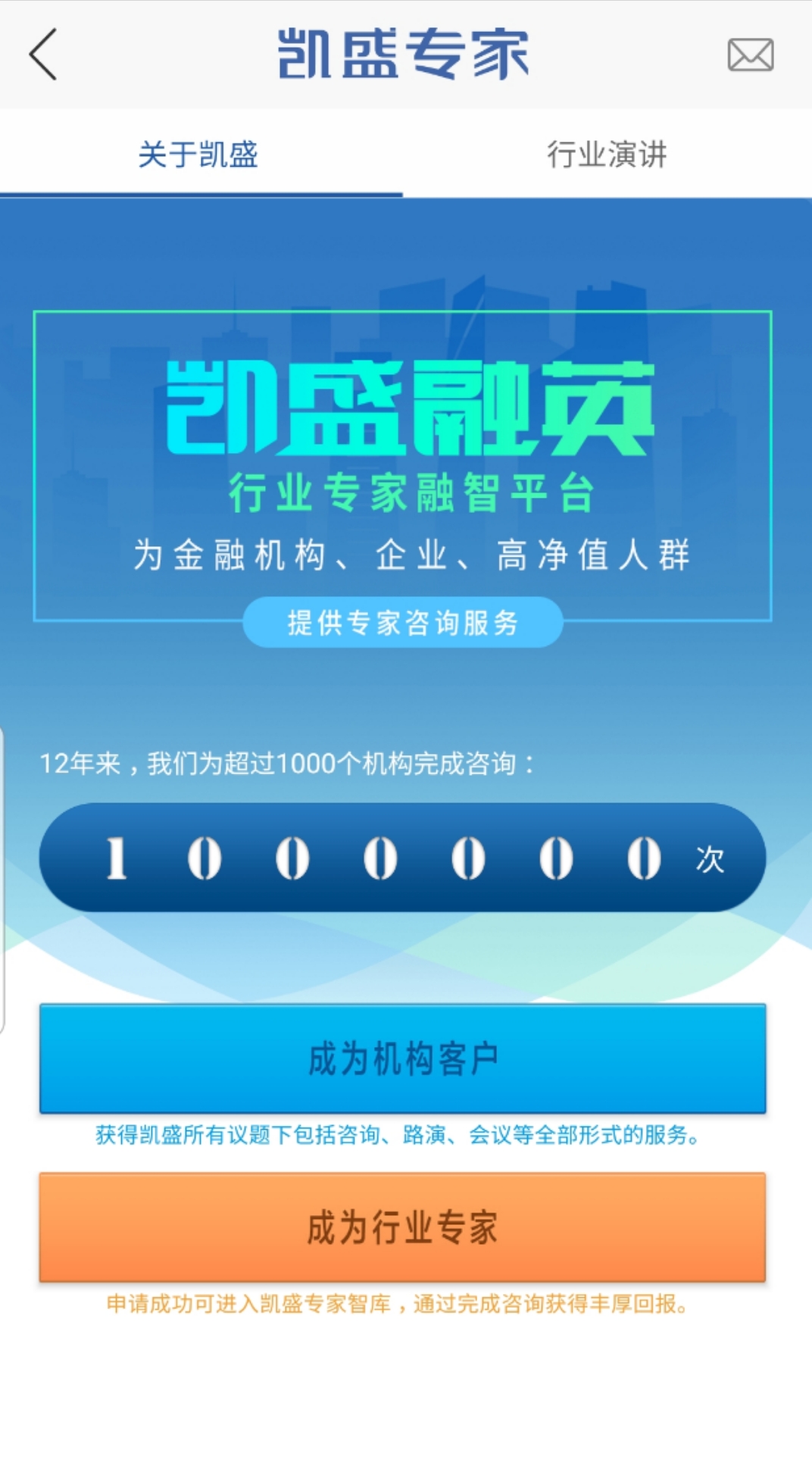 界面新闻记者查阅凯盛APP时发现,页面中有“成为机构客户”和“成为行业专家”两个入口,根据介绍,若申请成功,即可进入专家智库,并且“通过完成咨询获得丰厚回报。”