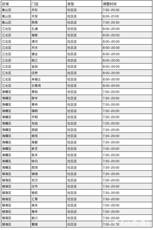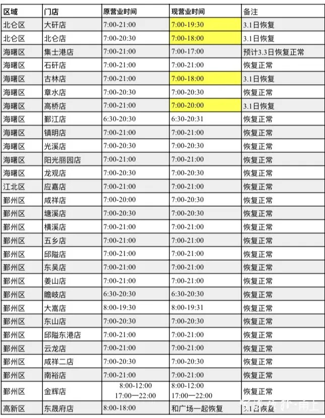 三江宁波地区门店3月1日起也将进行全面恢复调整。其中海曙、镇海区域门店营业时间调整至7:30-20:00;鄞州原江东区域门店恢复至7:30-20:00;鄞西区门店恢复至8:00-20:00。鄞东区门店部分7:00-20:00、部分7:30-20:00。