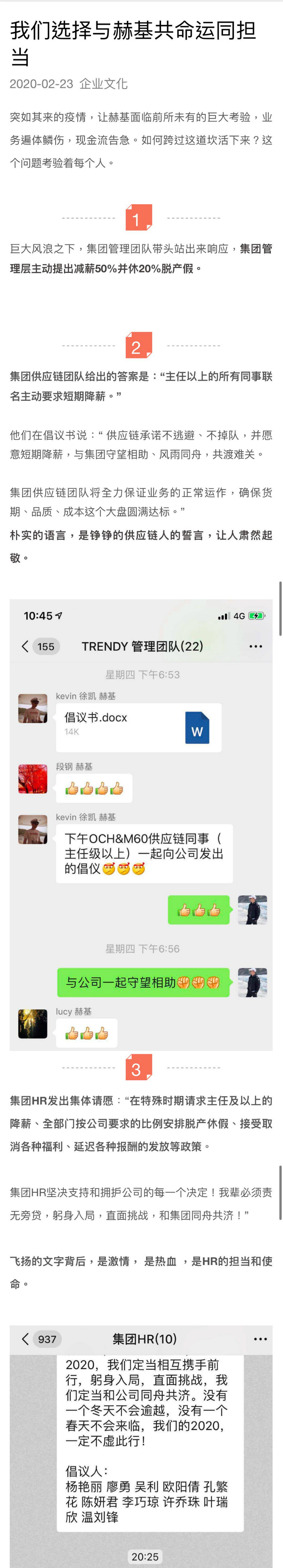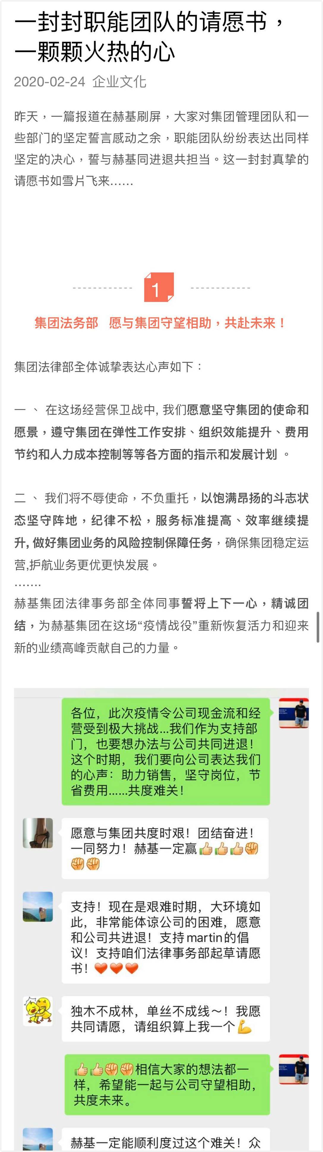2月24日,赫基集团内部再次发文《一封封职能团队的请愿书,一颗颗火热的心》,放出各部门响应号召的微信聊天截图,表示有更多部门加入自愿降薪行列。