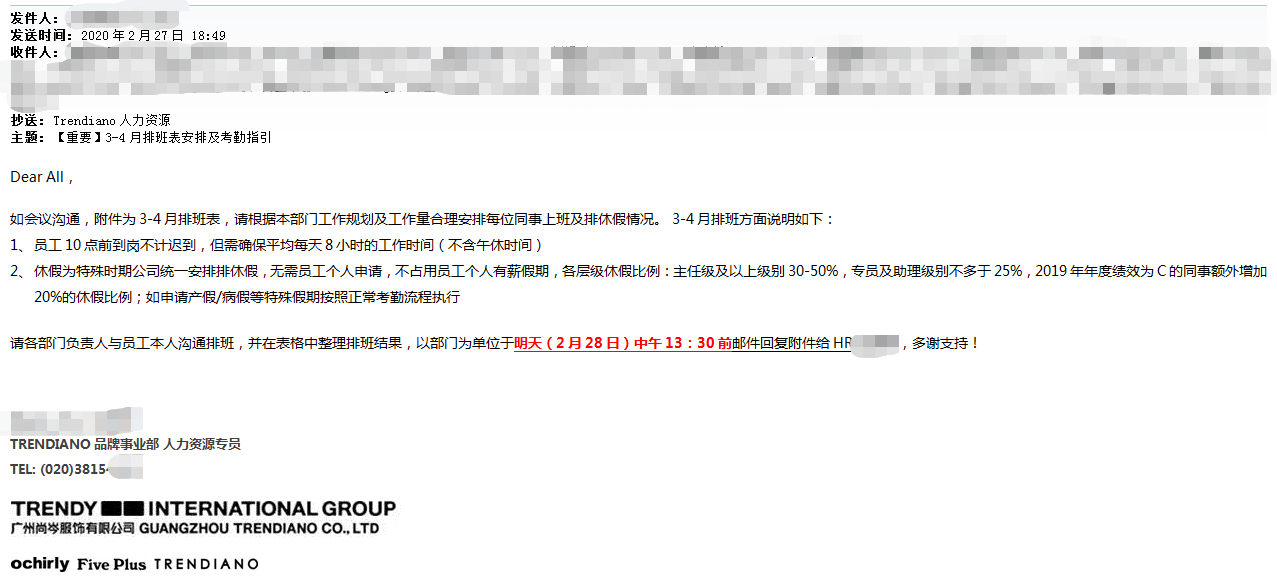 之后,各品牌HR开始与员工电话沟通降薪、休无薪假细则。