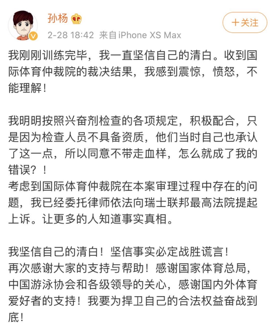 北京时间2月28日,收到国际体育仲裁法庭对自己禁赛八年的判决之后,刚刚结束了一天训练的中国游泳奥运三金王孙杨在个人社交平台上表态——