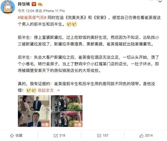 两部剧共用部分配角,也让不少观众“串戏”。比如,《完美关系》中的“浪里小白龙”杜威廉,是《安家》中的阿拉丁房地产经理;“软饭男”崔英俊则客串了小红帽房地产的经理。作为话题担当,#崔英俊是洪店长##被崔英俊气死#等话题频繁登上热搜,有脑洞大的网友用两部剧串联起了一个男人的一生。