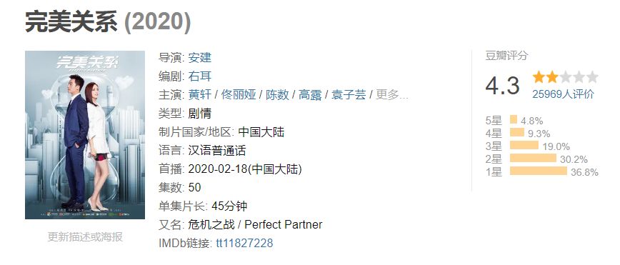 相比收视、热度的居高不下,《完美关系》的口碑陷入“崩坏”窘境,在豆瓣上,从开画时的5.2分,一路下滑至4.3分,是近期剧集口碑低谷。