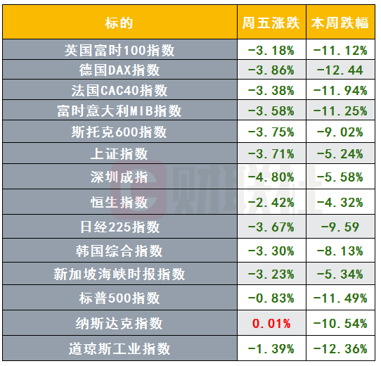 周五美股三大股指收盘涨跌不一,其中,道指跌1.39%,标普500指数跌0.82%,纳指微涨0.01%。大型科技股涨跌不一,苹果跌0.06%,亚马逊跌0.03%,奈飞跌0.72%,谷歌涨1.85%,Facebook涨1.43%,微软涨2.42%。本周,道指累跌逾12%,纳指累跌逾10%,标普500指数累跌逾11%,三大指数均创下2008年10月以来的最大单周跌幅。本月,道指累跌逾10%,纳指累跌逾6%,标普500指数累跌逾8%。