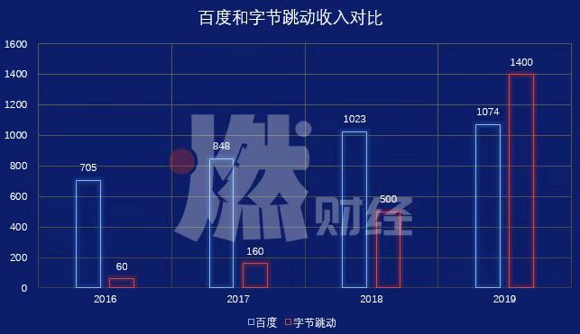 百度和字节跳动营收对比 制图 / 燃财经。(字节跳动2019年营收1400亿为外界猜测,未经证实)