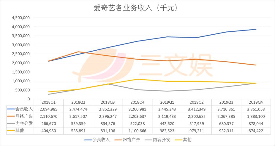 爱奇艺能保持稳定增长,要归功于2019年在会员业务上持续发力,会员收入增长的速度跑赢了广告收入下滑的速度。
