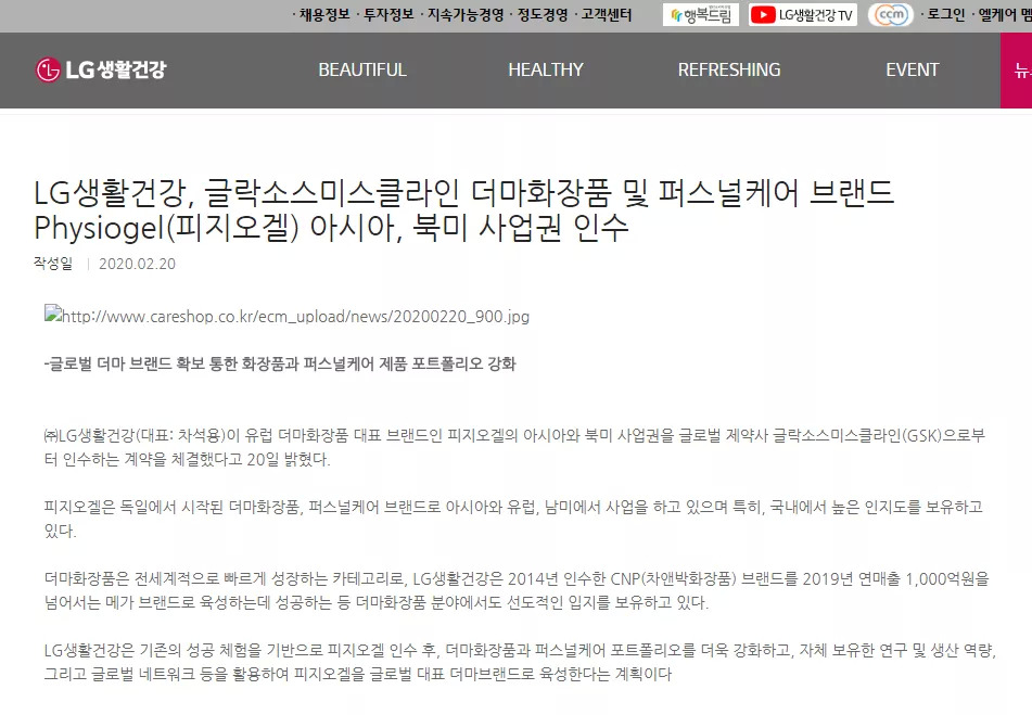 近日,韩国第二大化妆品集团LG生活健康发布消息称,本月20日,已与葛兰素史克公司(GSK)签订了收购合同,获得该公司旗下清洁美容品牌霏丝佳 (Physiogel)在亚洲和北美的业务。