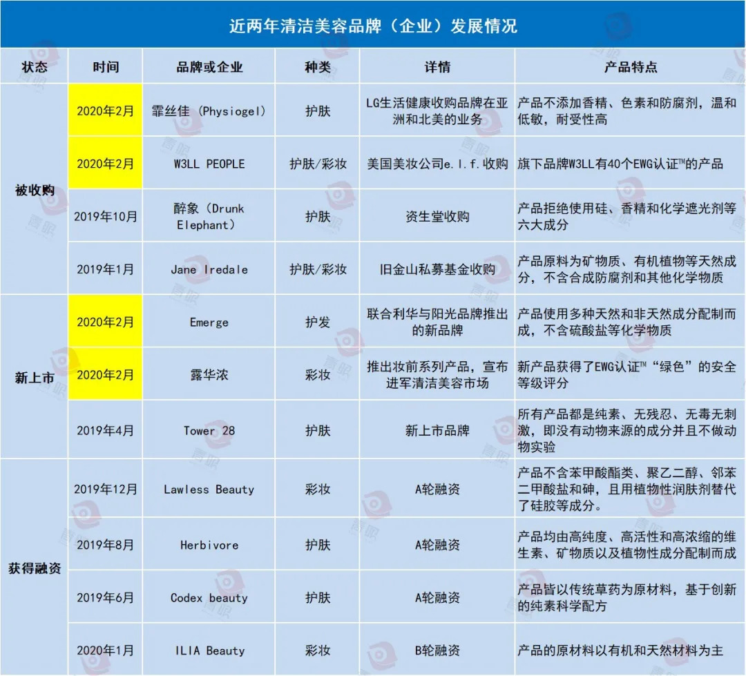 据青眼不完全统计,近两年内,共有4个清洁美容新品牌被收购;3家公司推出了清洁美容新品牌或新产品; 4个清洁美容品牌获得融资。其中,仅在今年2月份一个月之内,就有4家美妆企业布局清洁美容领域(见下表)。