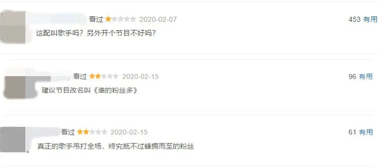 而点开豆瓣的“差评”,打低分的观众或吐槽本季歌手咖位的不足,或将矛头指向唱高音的高手,或惋惜于毛不易这种“清流”的存在,或批评粉丝群体对节目的影响。将风格和受众都差异巨大的歌手放在一起比赛,连标准本身都已受到了质疑。