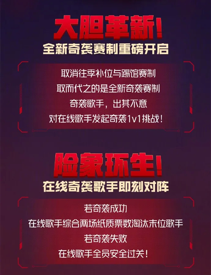 “奇袭”是本届《歌手》的创新赛制,比之前空降歌手的“补位”和一轮仅一次的“踢馆”更为刺激。赛制规定一轮有三位奇袭歌手,可在任意一位歌手表演时选择奇袭并进入1V1比拼,比拼票数高,则一轮综合第七的歌手淘汰。