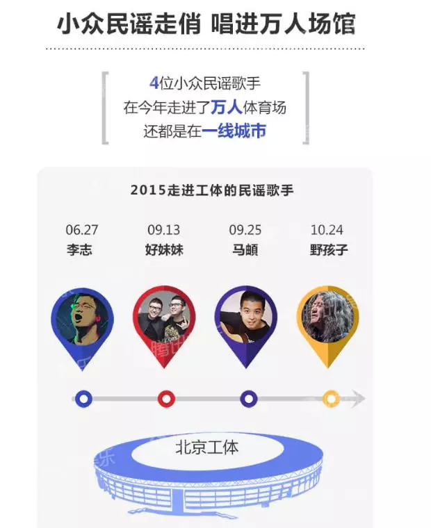 可专业人士的观点,改变不了大众和市场的审美分化。这一年《中国好声音》的冠军被唱民谣的张磊拿下,是“小众音乐”民谣成为大众文化的一个象征事件。同年,知名的民谣歌手身价都翻了2-3倍,4位民谣歌手唱进了万人场馆。