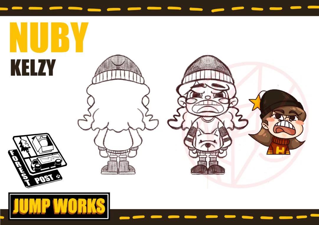 潮玩的设计、制作过程大致是,设计师首先建立一个角色宇宙。比如小李,她的“森林邮便局”并不是只有单个人物,而更多的是一个场景。主角Nuby是其中一个角色,小李给Nuby的怪癖定义为“没睡懒觉会咧着嘴发脾气一整天。”Nuby的记忆点就是她的嘴巴,看起来凶凶的。