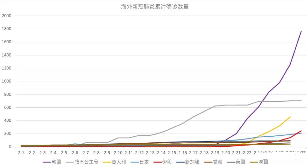 (以韩国、日本、意大利为主的海外确诊人数飙升 来源:互联网)